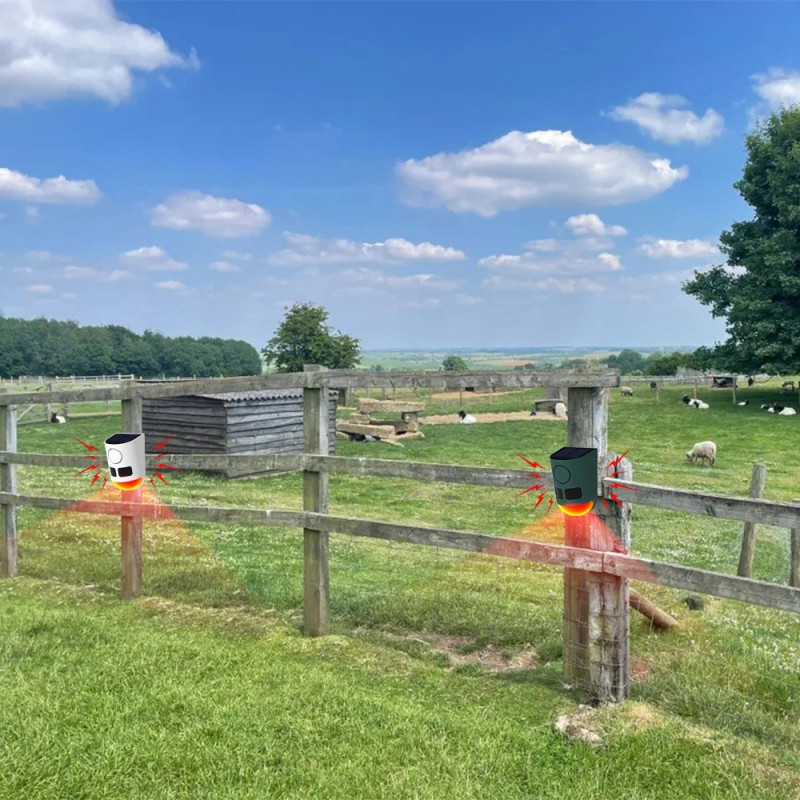 【Mångsidiga larmljud】Innehåller 13 olika larmljud, inklusive hundskall, vargylande och sirener, med en maximal volym på 129 decibel för att effektivt avskräcka inkräktare och vilda djur.
