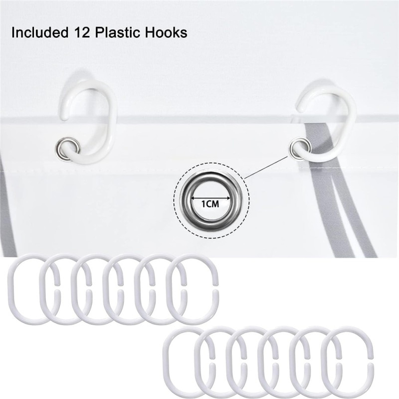 【Mångsidig kompatibilitet】Kompatibel med de flesta typer av krokar och duschdraperiringar, vilket möjliggör enkel och naturlig upphängning med ett vackert draperi. Levereras med plastkrokar som aldrig bleknar och glider smidigt.