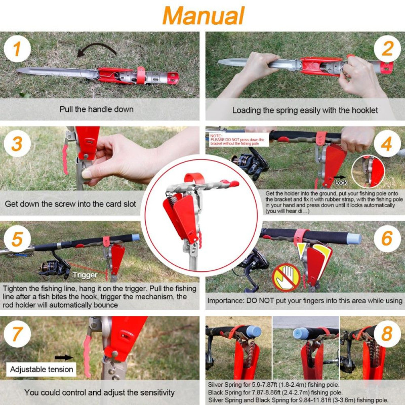 Justera fjädrarna så att de passar ditt fiskespö och behov, vilket hjälper dig att fiska mer effektivt. Fjädrarna kan enkelt laddas eller lossas med hjälp av krokar