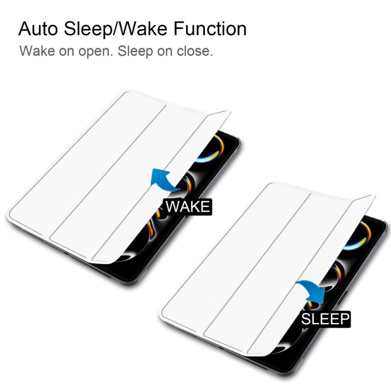 För iPad Pro 11 (2024) Fodral Auto Väcka / Sova Tri-fold Ställning Tabletthölje - Vit Detta fodral kännetecknas av delikat PU-läder, kombinerat med ett PC-innerfodral, fin kvalitet och ett frestande utseende. Tri-fold ställningsdesign ger en lämplig vinkel för dig att läsa, skriva och titta på videor, vilket förenklar ditt arbete och liv. Mikrofiberfoder är repbeständigt och smutsavvisande och skyddar din tablets skärm.