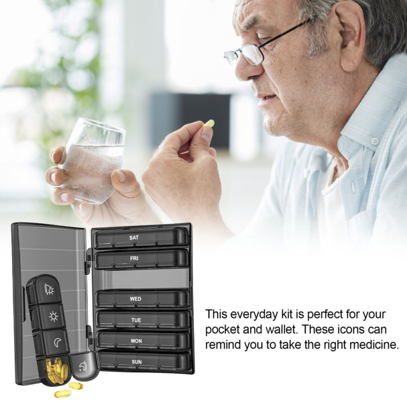 Yttre pillerbehållare och varje daglig pillerfodral har snäppstängda lock. Denna dubbla skyddsdesign gör att locken på tablettboxen 4 gånger om dagen alltid förblir stängda