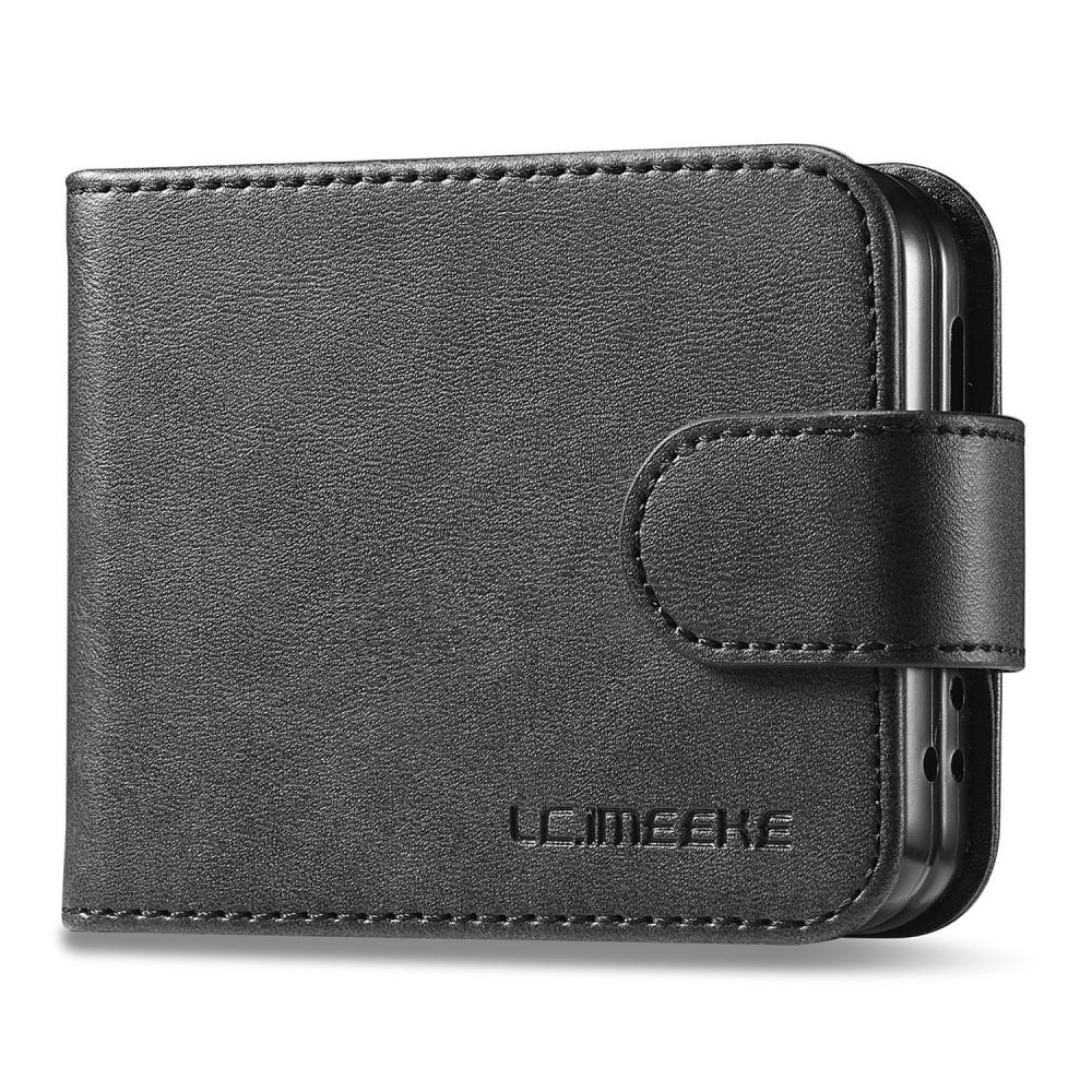 LC.IMEEKE til Samsung Galaxy Z Flip5 5G PU-lædertelefontaske Kortholder Kalvteksturstativbetræk - sort Lavet af kvalitets PU-læder+hårdt pc-bundetui, slidstærkt og uklageligt til langvarig brug Læ