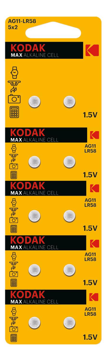 Kodak MAX AG11/LR58 mikroalkaliske knappceller (10-pakning perforert) 1.5V. Mikroalkaliknappceller brukes hovedsakelig i mindre elektroniske enheter som laserpekere, kalkulatorer, fjernkontroller, enkle klokker og leker etc.