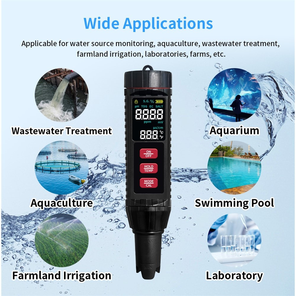 【7-i-1 multifunktionel testning】Denne bærbare enhed tilbyder højpræcisionstestning af TDS, EC, temperatur, pH, saltindhold, specifik tyngdekraft og ORP.