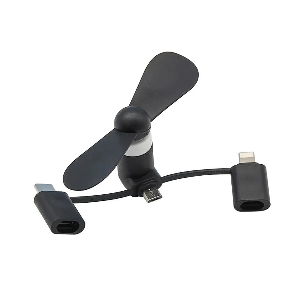 【Alsidig Kompatibilitet】3-i-1 USB-ventilator kompatibel med Micro USB, Type-C og 8-bens enheder, egnet til forskellige smartphones og bærbare computere.