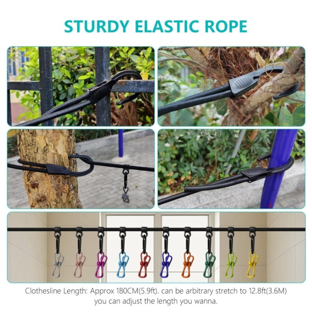 Den stærke tøjsnor kan fastgøres med to robuste kroge, rebets længde kan justeres til enhver tid, og der er ingen grund til at bekymre sig om, at krogen falder af