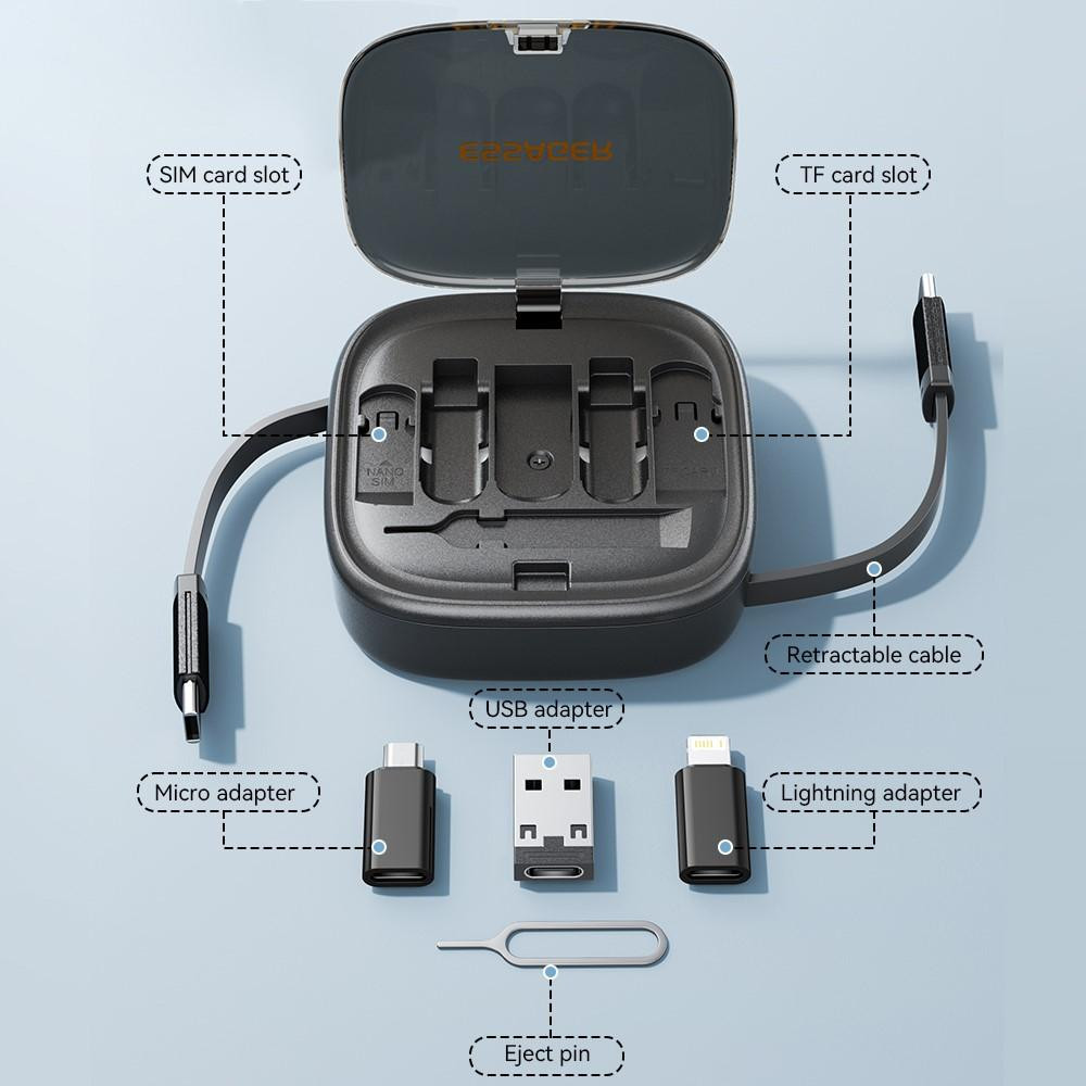 ESSAGER Integrated USB-C Adapter Cable Kit Charging Cable Case Convertor Contains Card Slot Phone Holder Design for Traveling - Black It is not just a Type-C cable adapter converter, you can also use it to charge your phone, transfer data, store your SIM card, and remove your phone SIM card