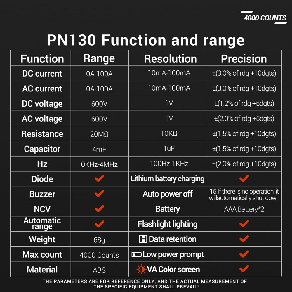 Additional features: Diode test, continuity test, NCV voltage detection, auto power off, auto range, data hold, low battery indication, flashlight