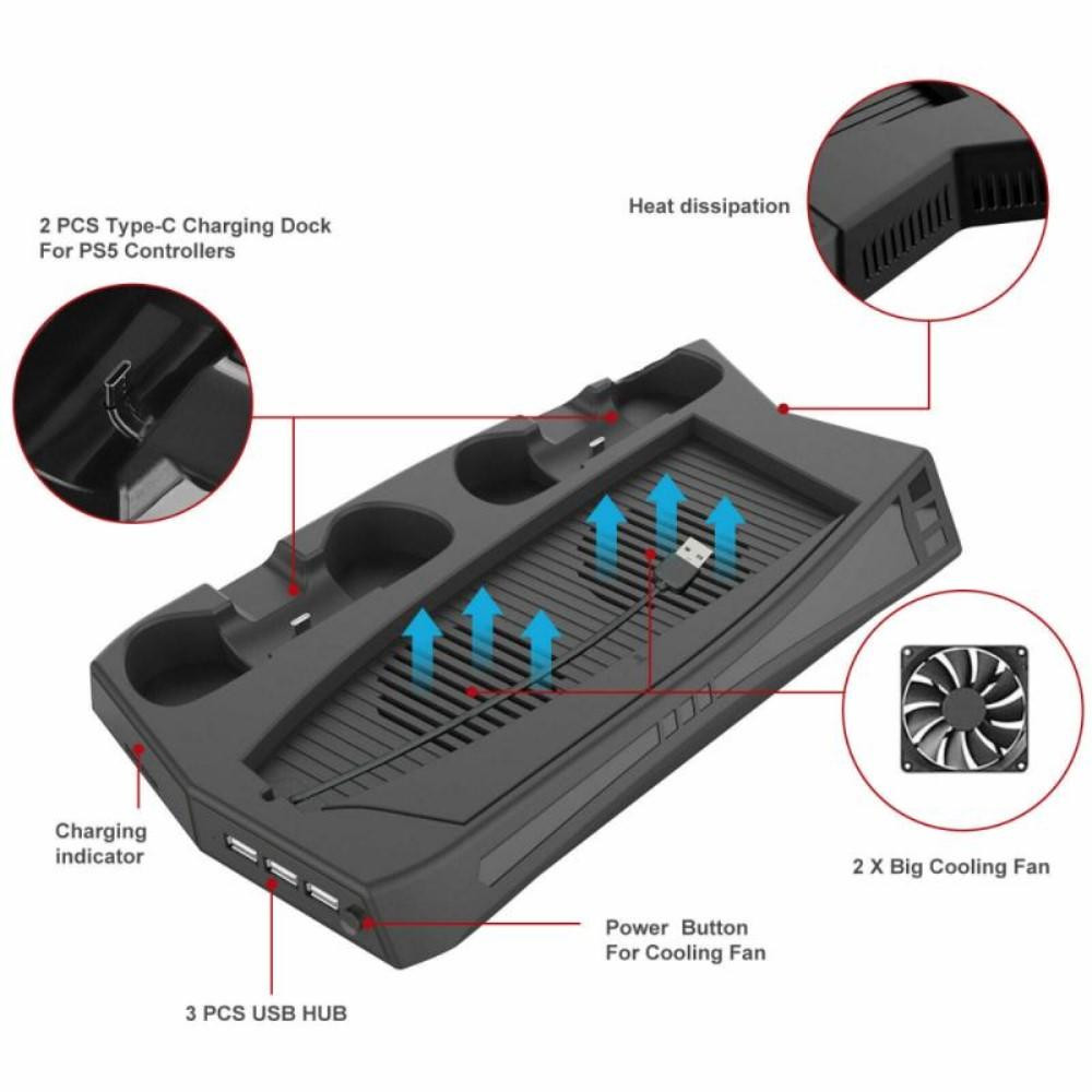 KJH-PS5-010 For Sony Playstation 5 UHD / DE Cooling Fan Design Game Controller Charger Host Holder Stand Controller Charger Station Designed for Sony Playstation 5 UHD/DE host