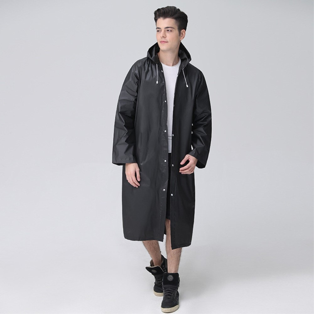 Raincoat Windproof Reusable Unisex rain poncho with hood - Black Made of EVA material, button closure design