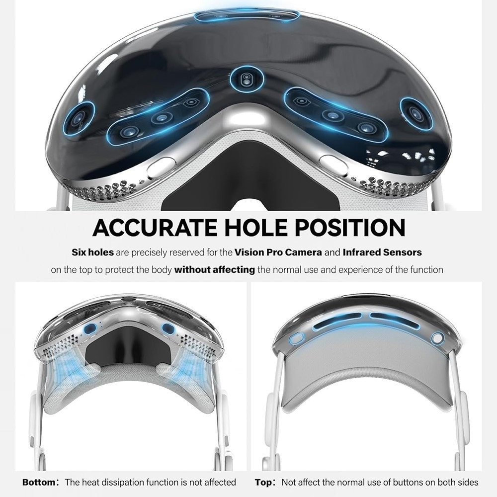 Precise Hole Positions: The transparent shell reserves 6 precise hole positions for the Vision Pro's camera and infrared sensor, which will not affect the normal wearing experience. At the same time, exact hole positions are reserved for the inlet and outlet radiators and the buttons, which will not affect the heat dissipation function and normal use of the buttons when worn.
