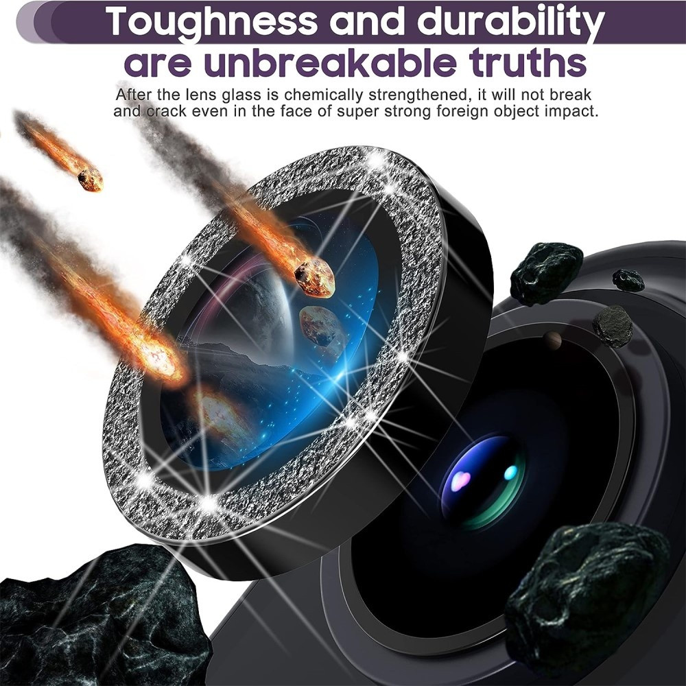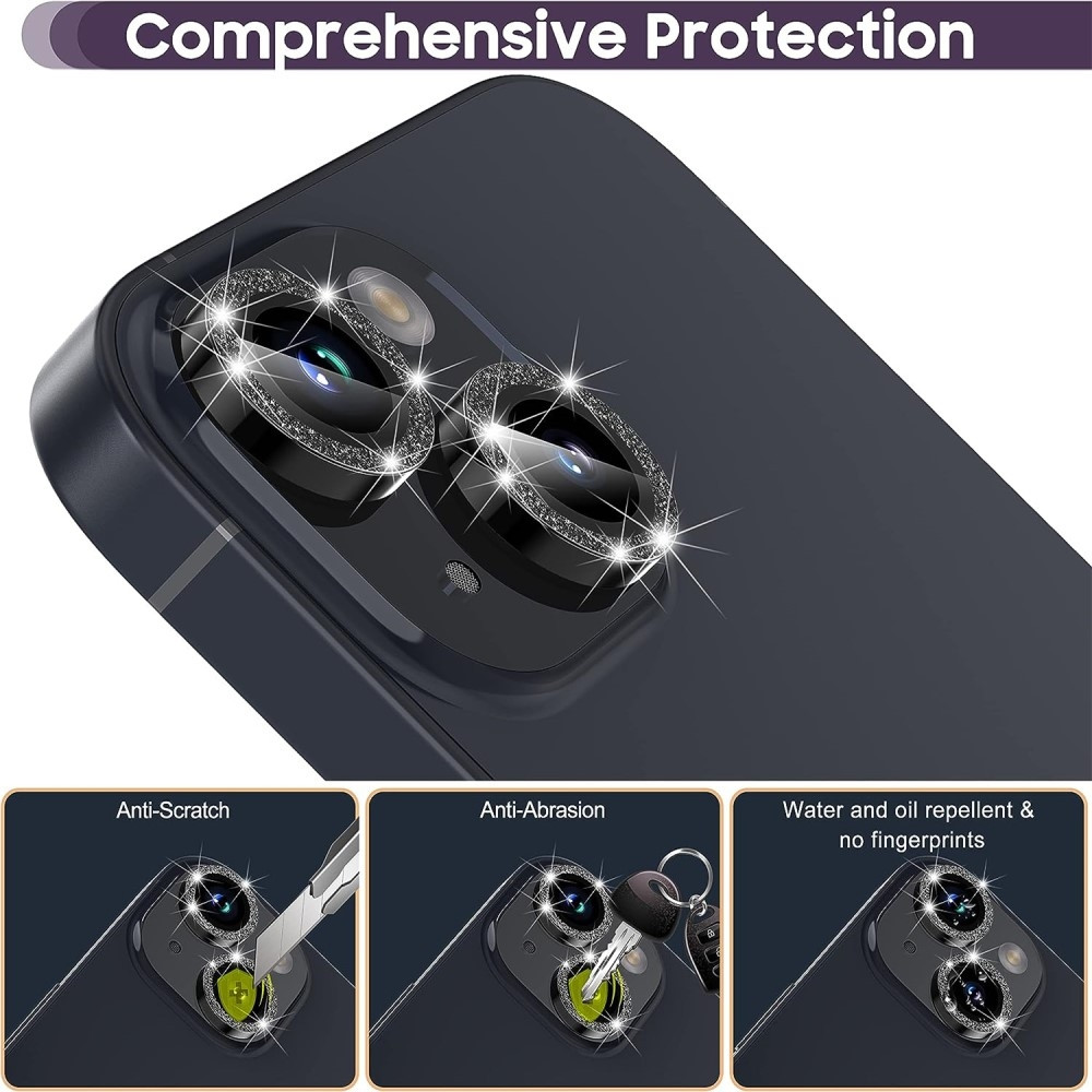 For iPhone 15 / 15 Plus Ring Circle Lens Film Set Glitter Metal+Tempered Glass Camera Lens Protector - Black Made of quality metal+tempered glass, durable to use