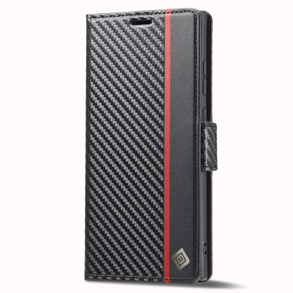 LC.IMEEKE Samsung Galaxy S24 Ultra Carbon Fiber Texture Phone Flip -nahkainen lompakkokotelo Pudotuskestävä matkapuhelimen kansi Valmistettu PU-nahasta + TPU-materiaaleista, kotelo on kestävä ja kestävä. Pinnalla on hiilikuiturakenne, kulutusta kestävä, pölytiivis ja sormenjälkiä estävä. Se sopii puhelimeesi täydellisesti.