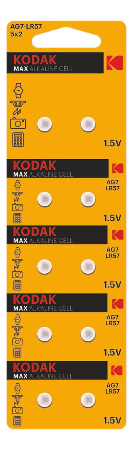 Kodak MAX AG7/LR57 mikroalkaliske knappceller (10-pakning perforert) 1.5V. Mikroalkaliknappceller brukes hovedsakelig i mindre elektroniske enheter som laserpekere, kalkulatorer, fjernkontroller, enkle klokker og leker etc.