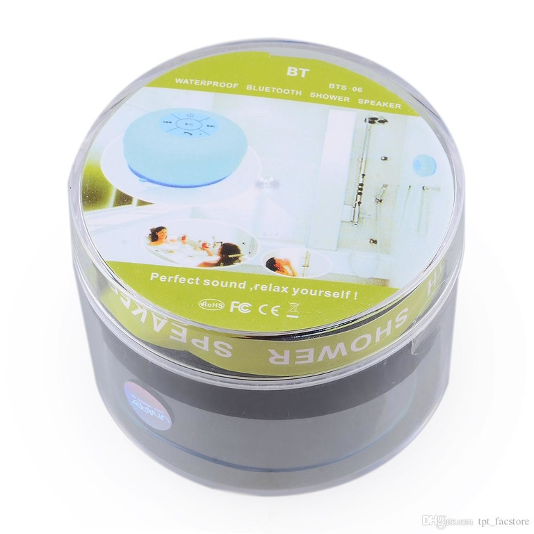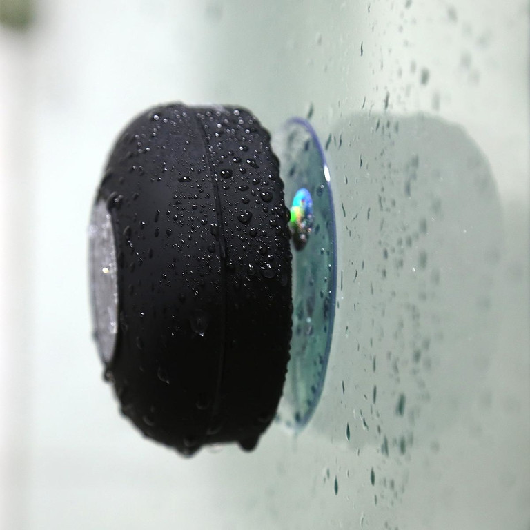 Liten Bluetooth-høyttaler som kan tilpasses bad, vanntett og med sugekopp for å kunne festes til te.x flisespeil eller annen flat overflate.