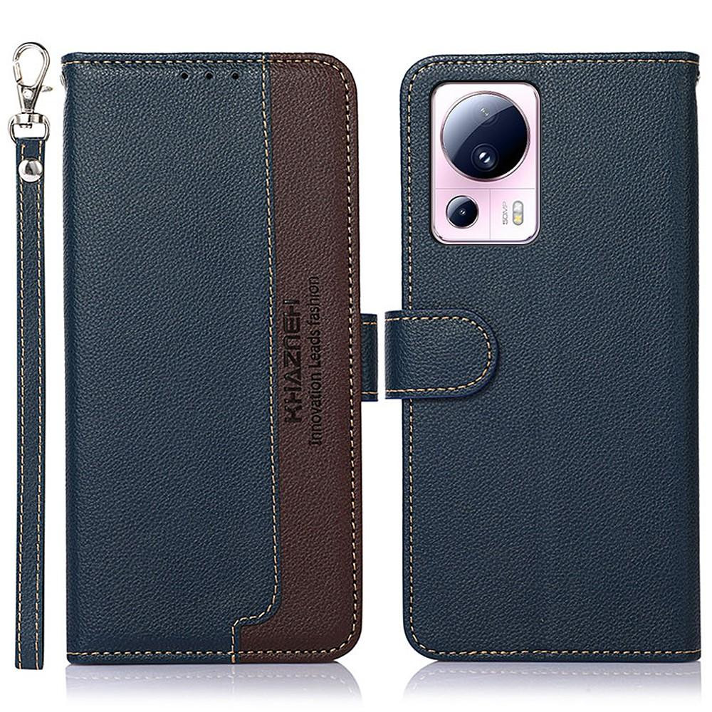 KHAZNEH RFID Blocking Litchi Texture PU-lærveske med stroppstativ lommebok fallsikkert deksel til Xiaomi 13 Lite - blå/brun Dette dekselet er laget av litchi-tekstur PU-lær som er slitesterkt, glatt