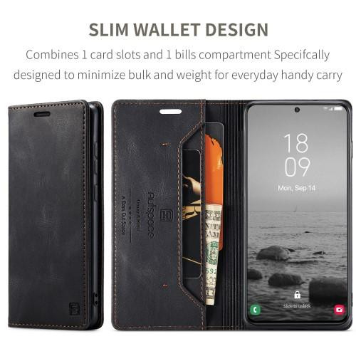 AUTSPACE A01-serien til Samsung Galaxy S23 RFID-blokkerende anti-drypptelefonveske Retro tekstur PU-lærlommebokstativ matt flip-telefonveske - svart premium PU-lær og mykt TPU indre veske med matt struktur gir en delikat berøringsfølelse RFID-blokkeringsteknologi Har som mål å beskytte din personlige informasjon mot å bli stjålet Praktisk design, den kombinerer lommeboken og telefonvesken til en praktisk enhet Håndfri visning og lesefunksjon Autoabsorbert magnetisk