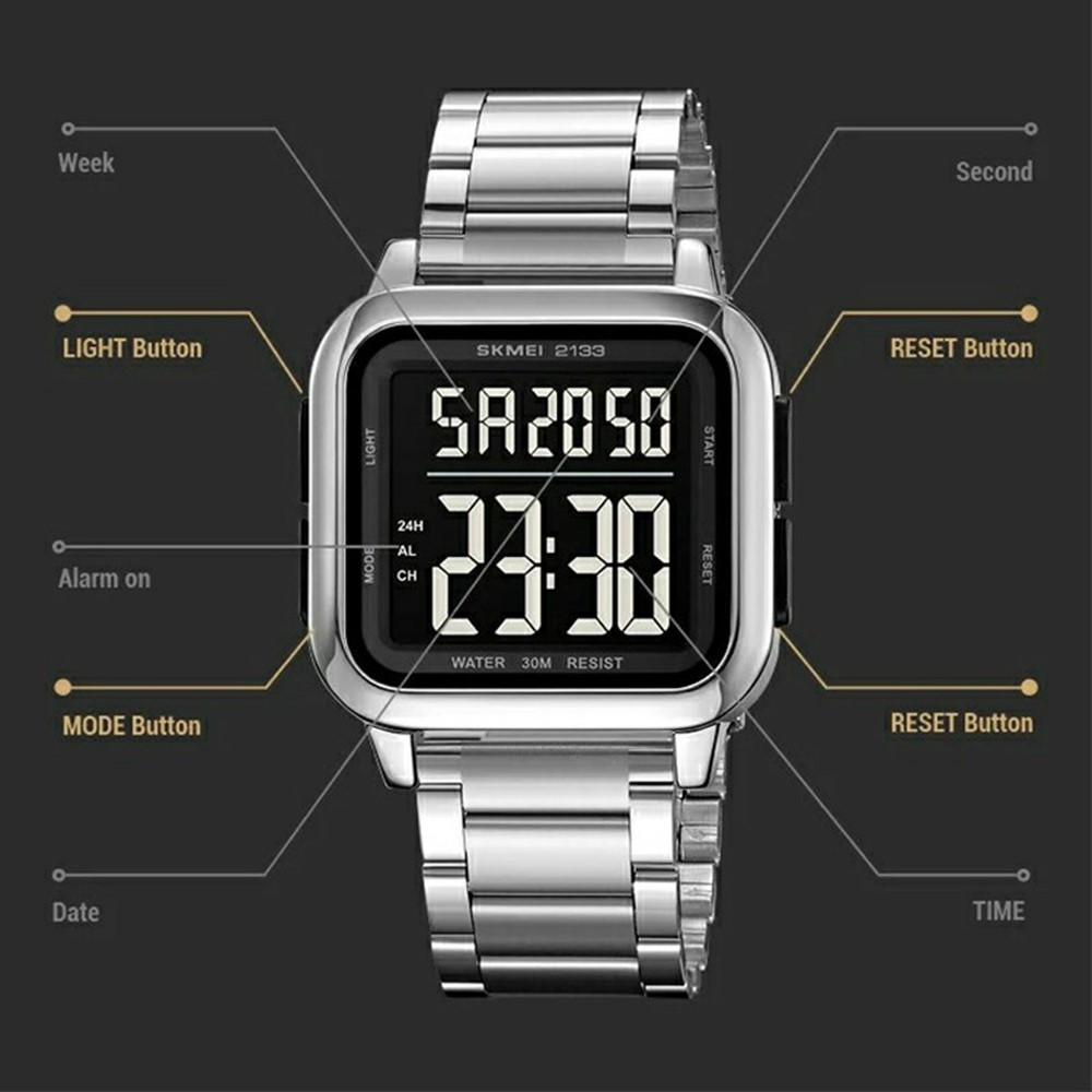 SKMEI 2133 Stilig digital klokke Studentstålstropp firkantet elektronisk klokke - svart【Komfortabel stropp i rustfritt stål】Slitesterk stropp i rustfritt stål gir en behagelig passform, perfekt for daglig bruk【Polert sinklegeringshus】Laget med en polert sinklegeringsveske for en eleganse og elegant finish【Mineral Glass Speiloverflate】Har en mineralglassspeiloverflate for klare bilder, med slitesterke og stabile egenskaper【Presis timing】
