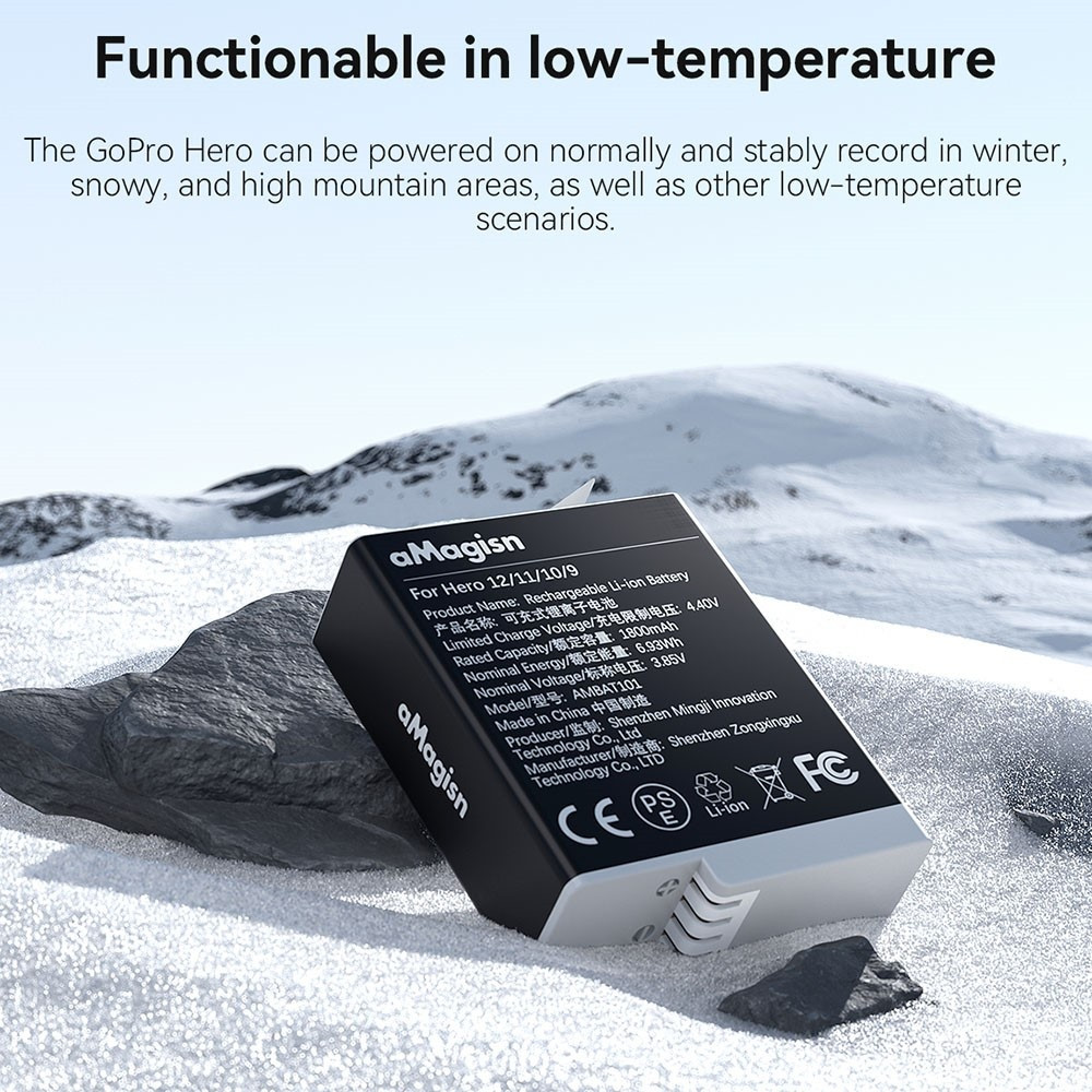 AMAGISN for GoPro Hero 12/11/10/9 Sportskamera 3.85V 1800mAh oppladbart litiumionbatteri Perfekt passform: Spesialdesignet for GoPro Hero 12/11/10/9, sikrer en tettsittende passform og kompatibilitet med alt tilhørende ladeutstyr Høy kapasitet: Med en kapasitet på 1800mAh tilbyr dette Li-ion-batteriet utvidet opptakstid, slik at du kan ta flere bilder i en enkelt lading Stabil ytelse ved lave temperaturer: Designet for å drive GoPro Hero selv under ekstreme forhold som vinter, snødekte miljøer