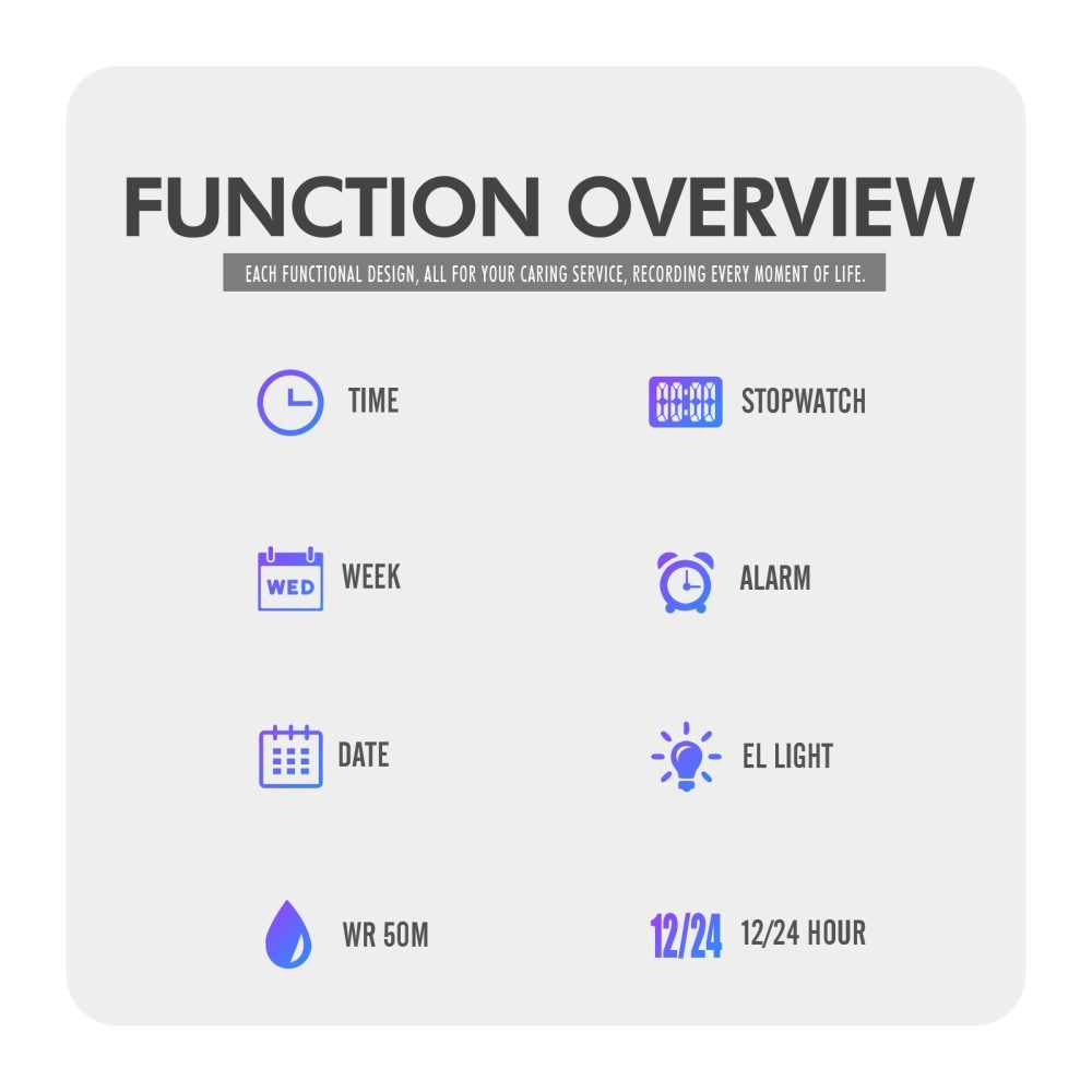 spenne Materiale: Rustfritt stål Skivebredde: 44,8 mm Skivehøyde: 50 mm Skivetykkelse: 16.5mm Båndbredde: 20mm Klokke Total lengde: 255 mm Funksjoner: Tid, Stoppeklokke, Dato, Timeralarm, Ukedag, Elektrisk lys, Timetid, 12/24 timers formatpakke inkluderer: 1 x klokke (med knappcelle) 1 x