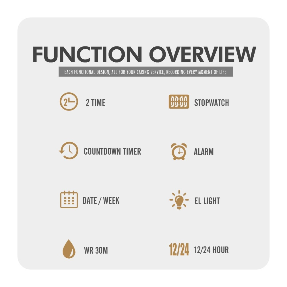 ykkelse: 8,8 mm Stroppbredde: 14,4 mm Total lengde på klokken: 230 mm Pakken inkluderer: 1 x klokke (med knappcelle) 1 x engelsk brukerhåndbok
