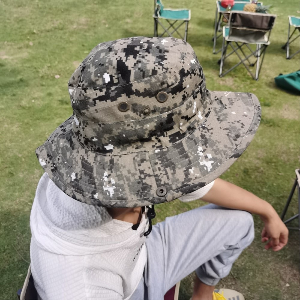 Kamuflasjebøttehette med myggnett Ansiktsnett for utendørs campingfiske - Khaki Denne hetten er laget av pustende stoff og er behagelig å ha på Hakeremmen hindrer hatten i å blåse bort av vinden Den brede hatten blokkerer skadelige ultrafiolette stråler Hovednettet beskytter effektivt ansiktet og hodet mot biter Perfekt for fiskere, bønder, birøktere, bobiler osv. Spesifikasjon: Materiale: pustende stoff+mesh Hatt: hodeomkrets: 58 cm, rand: 7 cm, hettehøyde: 11 cm, ytterdiameter på hetten
