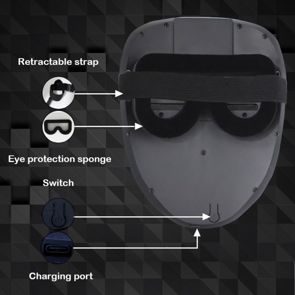 RGB LED-maske Gesture Face Changing Glowing Mask Halloween Party Bar Prom Props Designet med 25 dynamiske mønstre + 25 statiske mønstre Støtter bevegelsesføling for å endre mønsteret Innebygd 700mAh litiumbatteri, med lang brukstid Egnet for fester, danser, konserter, nattklubber, bursdagsfester osv. Spesifikasjon: Antall lampeperler: 234 3535RGB lampeperler Batteri: 603040-700mAh Skallmateriale: ABS plast+svamp Inngangsspenning/strøm: 5V/1A Ladetype: