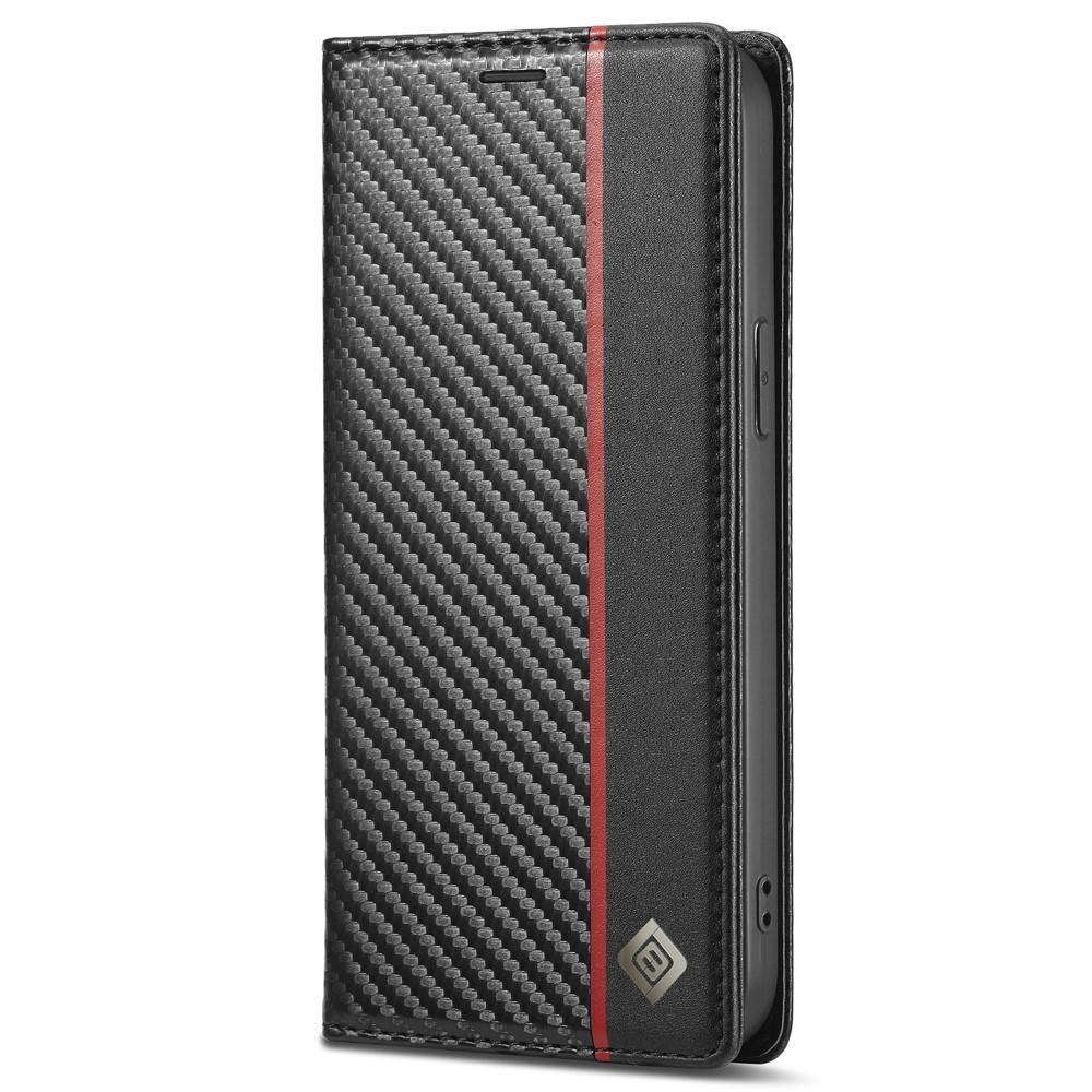 LC.IMEEKE til iPhone 15 Plus Carbon Fiber Texture Phone Flip Leather Lommebok-deksel Dropsikkert mobiltelefonveske Laget av PU-skinn+termoplastisk materiale, dekselet er tøft og holdbart. Overflaten har karbonfiberstruktur, slitesterk, støvtett og anti-fingeravtrykk. Den passer perfekt til telefonen din.